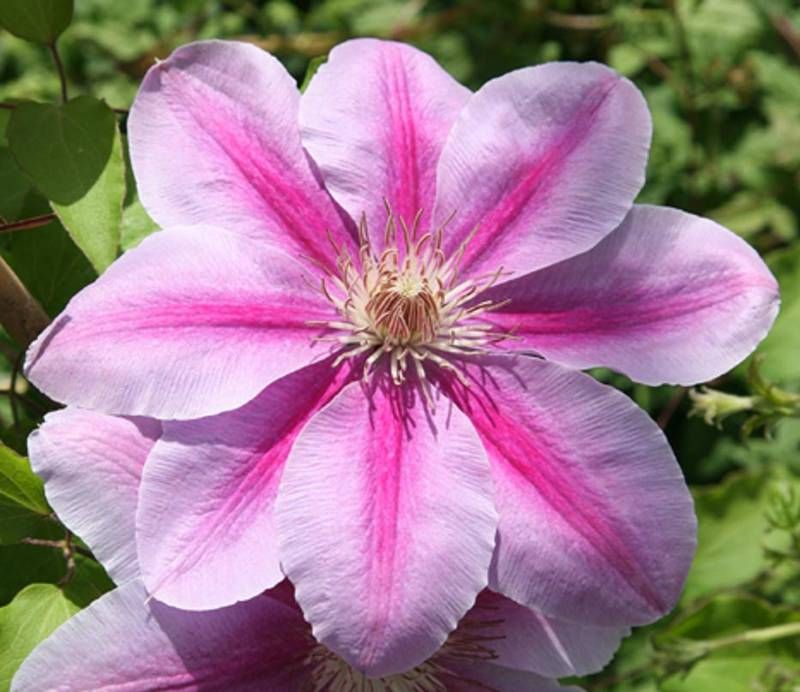 Клематис "Bees Jubilee" – это крупноцветковый сорт с розовыми цветками, украшенными темной полосой. Он цветет дважды в год: первый раз с мая по июнь на прошлогодних побегах, а второй раз – с августа до заморозков на побегах текущего года. Высота побегов достигает 2,5 метра, а ширина – до 1 метра. Диаметр цветков составляет около 16-18 см. Этот клематис идеально подходит для украшения дворов, дач, садов и приусадебных участков. Он отлично смотрится при вертикальном озеленении стен, специально изготовленных опор, решеток и штакетников, а также среди кустарников и полукустарников.